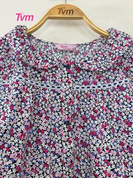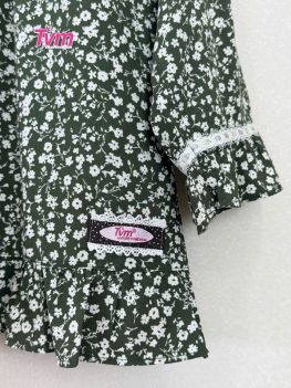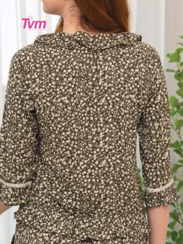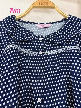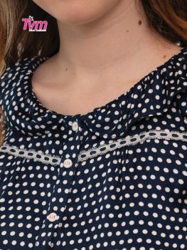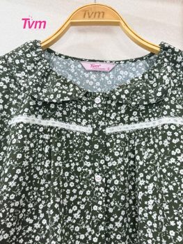Cổ lá sen nhún nhẹ tạo hiệu ứng như những cánh hoa đang nở, áo cài nút và kết hợp ren cotton trang trí phân đô áo