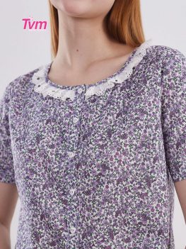 Áo ngắn tay, cài nút, Cổ áo tròn, có ren trang trí cổ áo